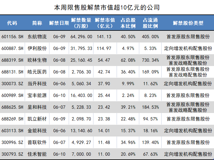 整体来看,解禁数量超过1亿股的公司有7家,前三分别为东航物流、伊利股份、欧林生物(688319.SH)。