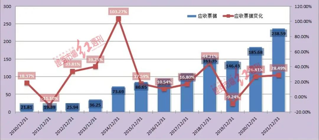 但通过应收票据的组成和变化能侧面了解公司的销售政策及市场地位。比如上面提到的公司A没有大量的应收票据,侧面说明B对其经销商的把控没有A强。2021年年报披露公司B的应收票据为238亿元,同比增加28.49%,也在正常变动范围内,异常情况出现在2014年,能看到正是白酒危机的时候,应收票据大幅飙升,可能是照顾经销商或者销售政策松动(见图1)。