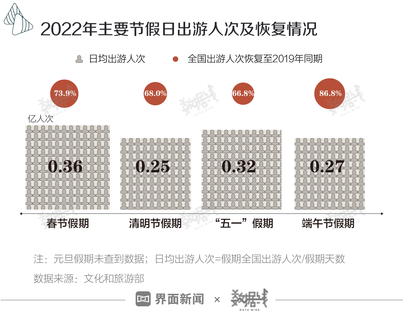 从出游人次来看,2022年上半年4个主要节假日中,端午节假期出游人次恢复至疫情前同期超8成水平,好于今年春节假期、清明节假期和“五一”假期。从单日出游人次平均值来看,据界面数据计算,端午假期单日出游约0.27亿人次,比同样天数的清明节假期高出5.6%。