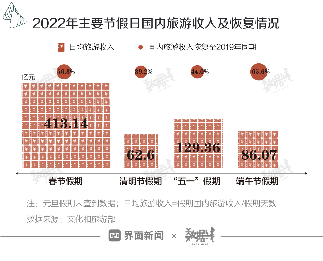 从国内旅游收入来看,2022年上半年4个主要节假日中,端午假期国内旅游收入恢复至疫情前同期超6成水平,好于其他3个假期。从日均旅游收入来看,据界面数据计算,端午假期日均旅游收入约86.07亿元,比同样天数的清明节假期高出3成多。