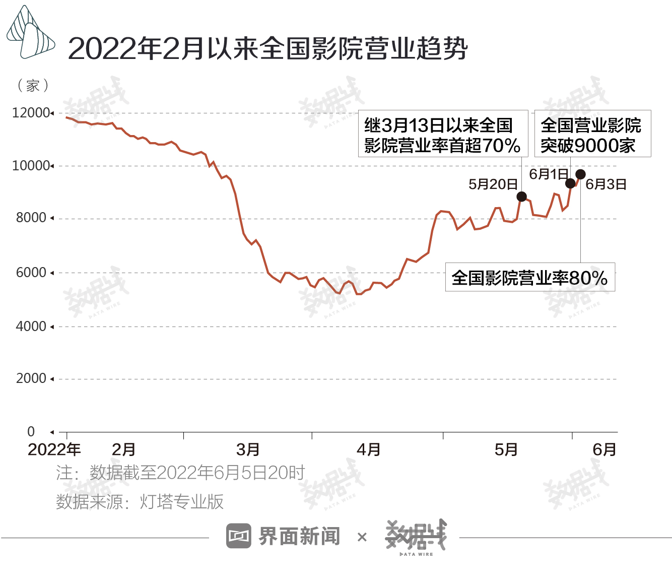 全国影院营业率恢复至约8成。据灯塔专业版数据,截至6月5日20时,6月4日全国营业影院总数9657家,连续4天超9000家,全国影院营业率为79.8%(有票房上报的影院)。此前,5月20日全国影院营业率继3月13日以来、时隔68天首次超过70%。14天后,6月3日全国影院营业率达80%。