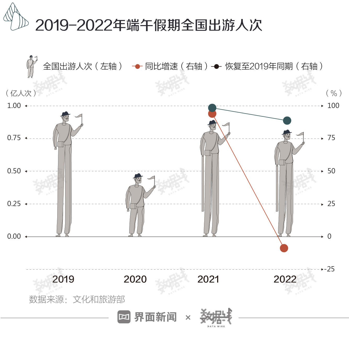 从出游人次来看,今年端午节假期出游人次高于2020年同期,但比2021年同期下降10.7%,按可比口径恢复至2019年同期的86.8%。