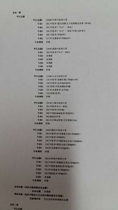 界面新闻记者从他的高考志愿表上看到,一本的6个志愿中,他填报了天津中医药大学、成都中医药大学、北京中医药大学、上海中医药大学、河北中医药大学和河南中医药大学6所医疗院校。其中,第一志愿天津中医大的专业选择中,他填报了4个不同学制的中医学和学制5年的针灸推拿学,且服从专业调剂。