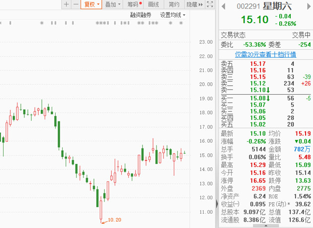6月6月早盘,星期六(002291.SZ)股票以15.16元/股开盘(+0.13%),随即“翻绿”下跌。当日开盘价和4月27日的近年最低股价10.20元/股相比,已经涨回48.63%。