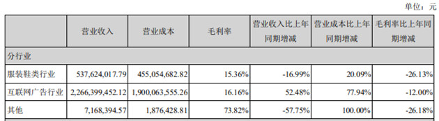 在2021年度互联网广告行业收入之中,互联网广告投放收入为1.63亿元,同比下降55.47%;互联网广告代理的收入为3.79亿元,同比增长251.67%;社交电商服务的收入为17.24亿元,同比增长70.35%。
