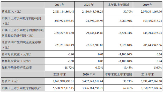 2021年度,星期六实现的营业收入为28.11亿元,比上一年度增长30.70%;归属于上市公司股东的净利润为-7.00亿元,和上一年度相比,由盈转亏,出现了-2,980.90%的巨幅变动(下降);不过,2021年度经营活动产生的现金流量净额为2.23亿元,和上一年度相比,由负转正,同比增长了3,028.60%。