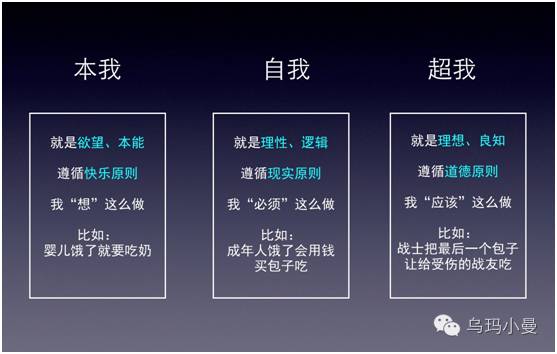 可以理解为,每个人的身体里都住了三个小人,本我小人、自我小人和超我小人,不同性质的外界刺激会引起它们不同程度的反应。这三个小人的存在,意味着在策划每一次营销活动之前,你都必须弄清楚你要驯服目标人群身体里的哪个小人,并且知晓它们的特点和软肋。