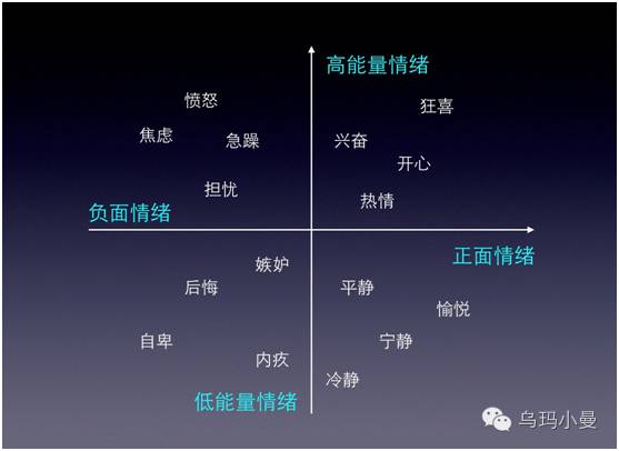 一个营销事件如果不能引起大众情绪的波澜,几乎很难达到刷屏级的效果。大众的哪些情绪最容易一触即发?我们可以根据情绪能量的高低和正负,把情绪大体分为以下四个象限: