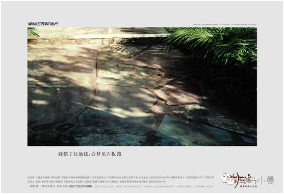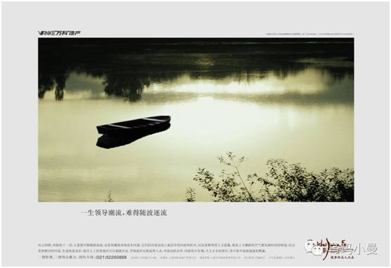 就像万科兰乔圣菲别墅的系列广告,只字不谈“华庭”、“御宅”、“豪居”,却只谈质朴的石板路、闲云野鹤的河道、名士邻人……只有到达一定高度,才敢如此低调,文案和画面的背后,似乎能看到一个阅尽名利繁华,用心领悟淡泊滋味的真名仕形象。