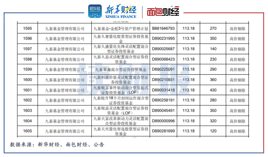 其中,九泰基金申报溢价率最高的股票是在科创板上市的海创药业-U。剔除无效报价后,海创药业-U的报价区间为10.10元/股-150.00元/股,最终发行定价42.92元/股。九泰基金报价113.18元/股,申报溢价率高达2.64倍,被剔除有效价格区间。