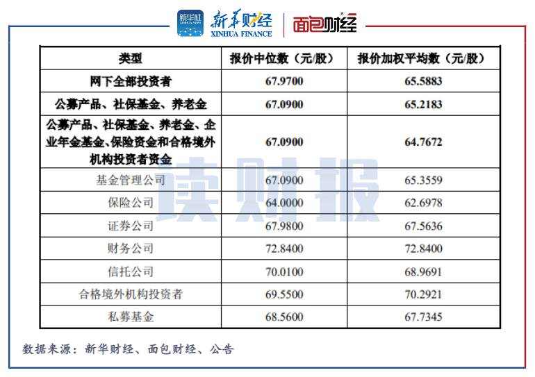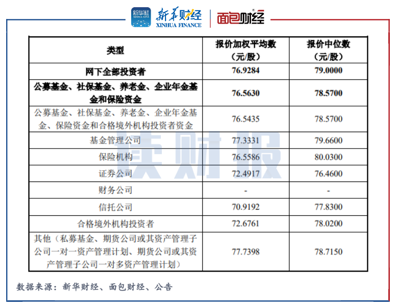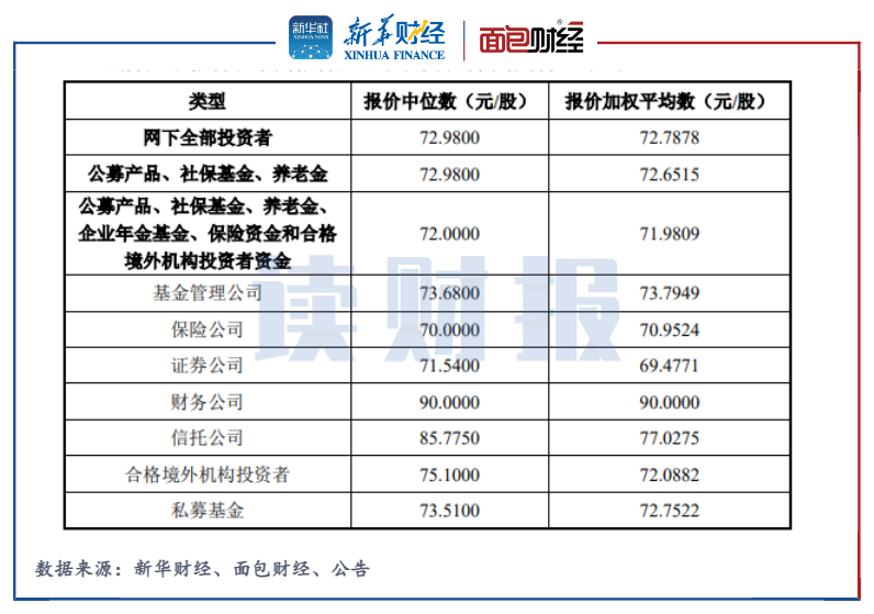 仁度生物在询价期间共收到383家网下投资者管理的9958个配售对象的初步询价报价信息,报价区间为7.50元/股-149.61元/股,拟申购数量总和为268.02亿股。在剔除无效、高价报价后,入围网下投资者的报价加权平均数为72.7878元/股,基金管理公司的加权平均数为73.7949元/股。