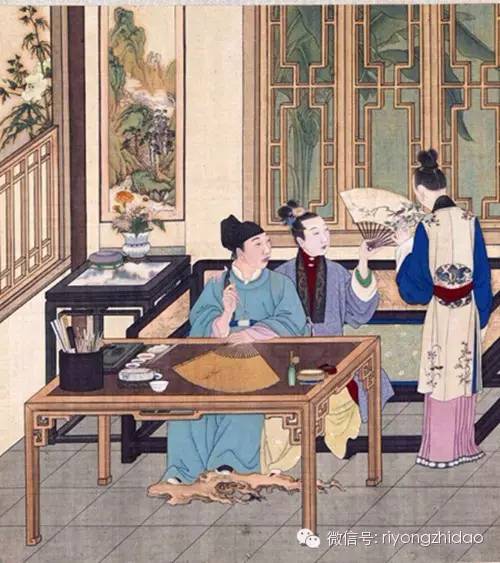 明代《长物志》中书房布置为:“左置榻床一,榻下滚脚凳一,床头小几一,上置古铜花尊,或哥窑定瓶一,花时则插花盈瓶,以集香气,闲时置蒲石于上,收朝露以清目。或置鼎炉一,用烧印篆清香。冬置暖砚炉一。壁间挂古琴,中置几一,如吴中云林几式最佳。壁间悬挂画一;书室中画惟二品,山水为上,花木次,鸟兽人物不与也 。壁间当可处悬壁瓶,四时插花,坐列吴兴笋凳六,禅椅一,拂尘,搔背,棕帚各一。竹铁如意一。右列书架一,上置周易 。这里是对明代书房陈设的真实写照,层次分明,疏朗有致,中心位置突出,书卷气息诱人。