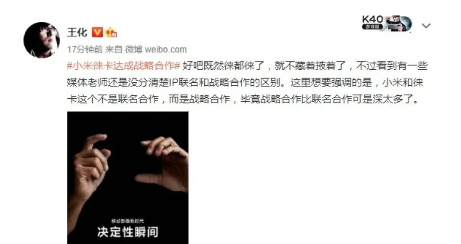 5月23日雷军在微博上发布一张海报,海报的重点是底部的小米logo与徕卡logo,相当于官宣小米与徕卡正式战略合作。众所周知,华为手机的相机一直是徕卡的,这次雷军相当于间接告诉大众:徕卡跟华为合作到此为止,接下来要跟小米手机合作了。
