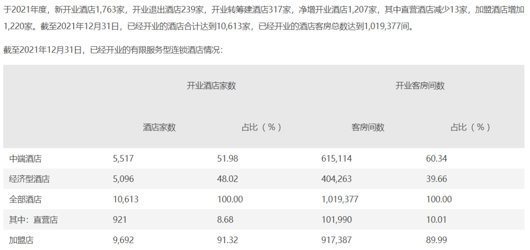而锦江酒店的35亿元也将用于进一步优化经济型酒店和中端酒店布局。财报显示,仅2021年,锦江酒店新开业酒店1763家,超额完成目标263家;净增开业酒店1207家,目前已开业酒店总计为10613家,中端酒店与经济型酒店占比分别为51.98%、48.02%。