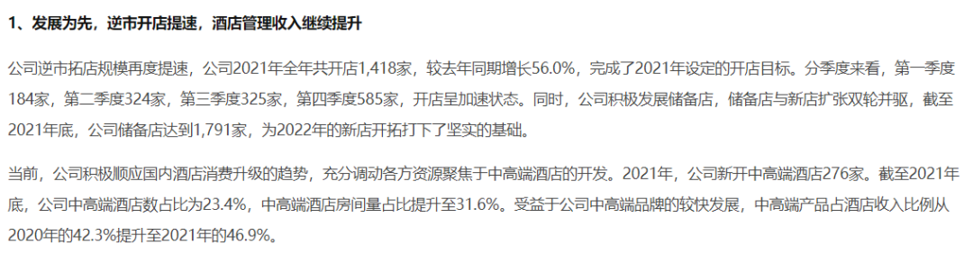 据年报,首旅酒店2021年全年共开店1418家,较去年同期增长56.0%,其中新开中高端酒店276家。截至2021年底,首旅酒店中高端酒店数占比为23.4%,中高端酒店房间量占比提升至31.6%。受益于首旅酒店中高端品牌的较快发展,中高端产品占酒店收入比例从2020年的42.3%提升至2021年的46.9%。