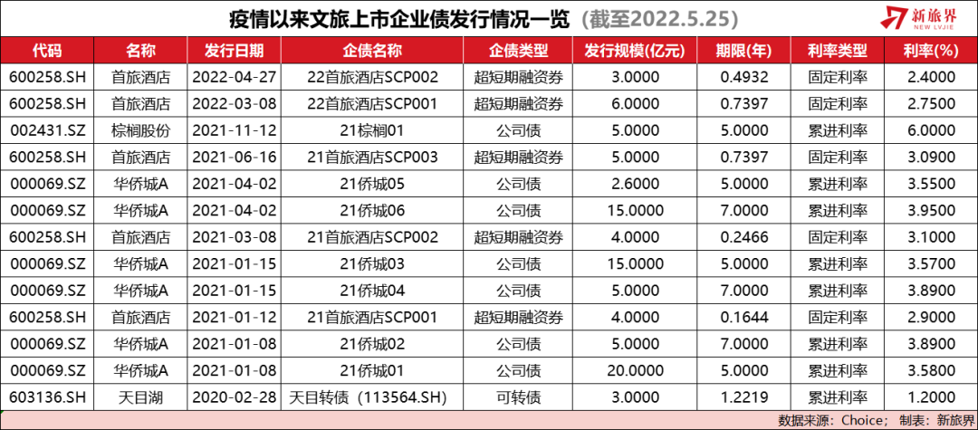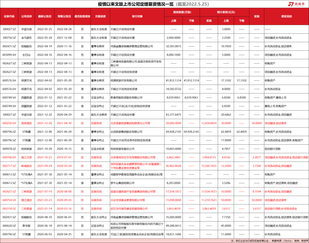 新旅界(LvJieMedia)通过梳理A股、港股、美股超50家文旅上市公司的融资数据发现,在2020年1月24日起至2022年5月25日期间,至少16家上市公司发布了定增预案,资金缺口超340亿元;至少5家拟通过发行公司债、超短融、可转债和中期票据等企业债来获取融资,发行规模逾110亿元。