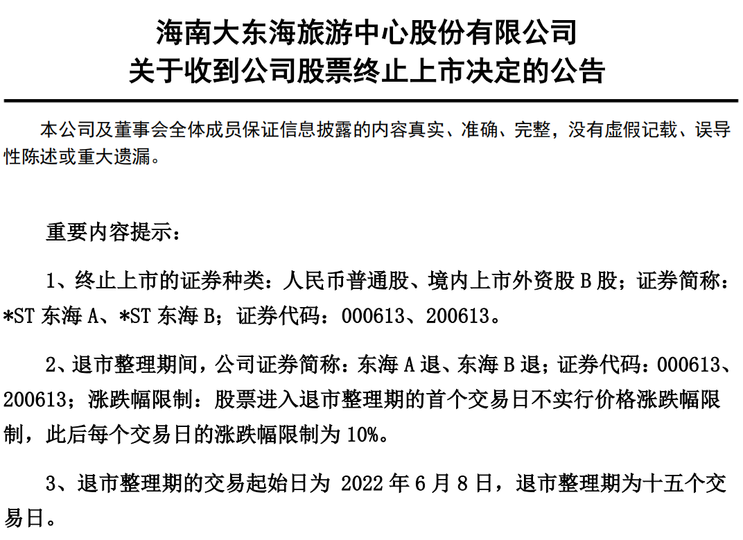 大东海A定增原本是出于保壳和自救,但由于其选中的收购对象恰好为教育类公司,撞上今年实施的教育双减政策,收购计划被迫取消,配套的定增计划也取消。定增取消后,多年来业绩未见有起色的大东海A最终还是倒在了疫情期间。由于公司年度2021年度扣非净利实为-418.84万元,再加上公司年度营收仅3023.45万不足亿元,这意味着大东海A触发了深交所财务类强制退市条件,将被深交所终止上市。