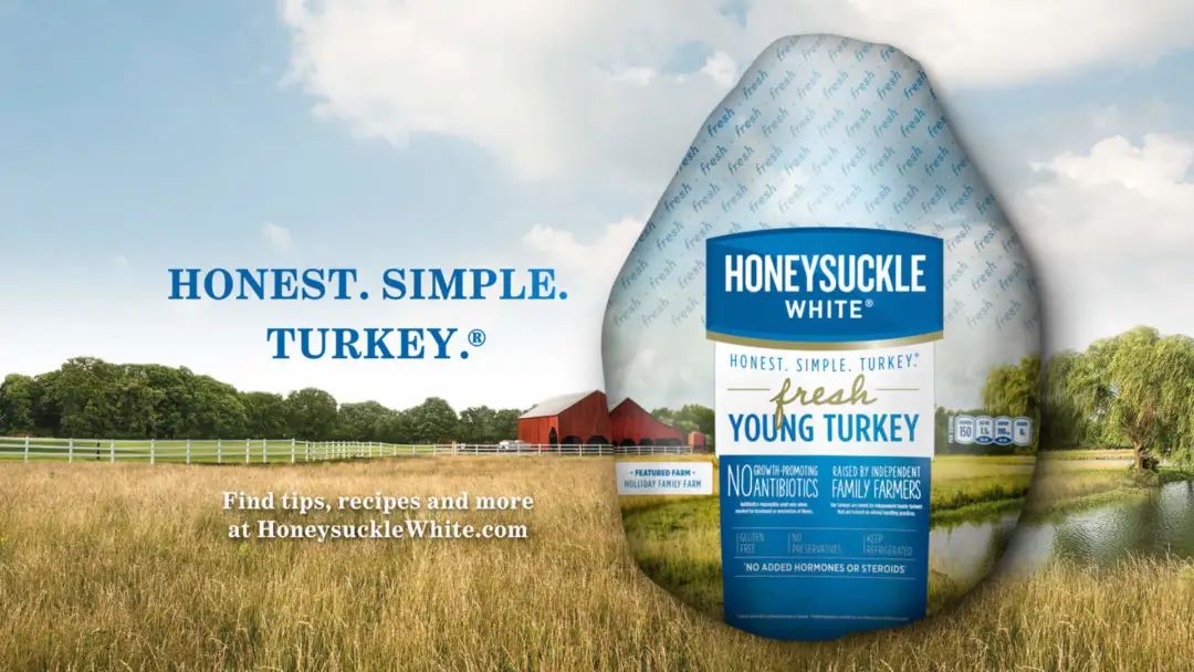 其次,企业采取的营销策略也在试图巩固食用肉类这一文化偏好,并有意强化肉类消费与节日、庆祝、仪式等关键词的联动。例如,2016年,美国大型食品加工企业Cargill在感恩节为旗下火鸡产品发布了一则节日限定广告,并打出“Honest. Simple. Turkey”口号,将感恩节的传统食物火鸡(Turkey)与其他积极的文化价值观相关联,也将感恩节吃火鸡这一饮食文化持续渗透进消费者认知中。