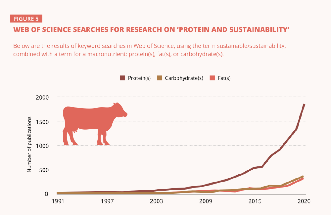 除了商业市场掀起“蛋白质热潮”,蛋白质也再次成为学术研究的焦点。1991年至2020年间,包含搜索词“蛋白质”和可持续性的学术期刊文章数量几乎是脂肪或碳水化合物相关文章数量的5倍,足见蛋白质在关于粮食系统未来的讨论中始终发挥着核心作用。