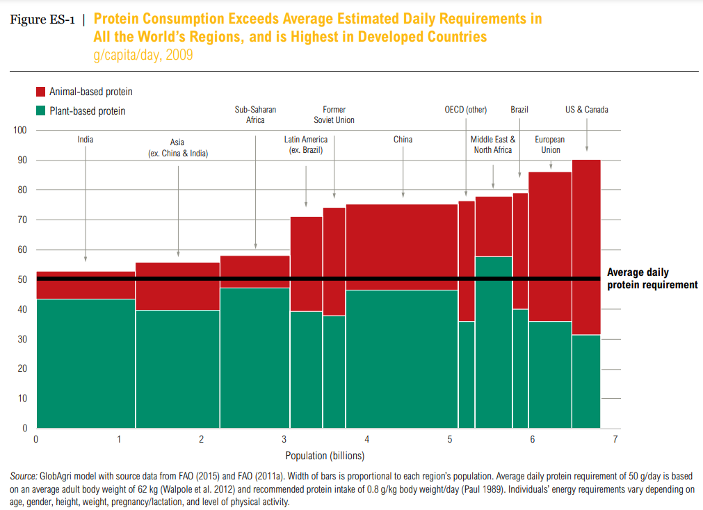 研究发现,全球大部分地区儿童的平均蛋白质摄入量远远高于建议水平。很多地区的蛋白质体量甚至存在总盈余,如非通过饲料作物将植物蛋白转化为动物蛋白,相信盈余将会更多。世界资源研究所(World Resources Institute,WRI)一项研究表明,2009年全球平均蛋白质消耗量就已达到每天每人约 68 克——比成人日常需求平均高出 以上,其中经济发达地区的蛋白质消耗量明显偏高。WRI预计整个美洲的动植物蛋白质盈余空间将继续扩增,撒哈拉以南的非洲地区也将保持少量盈余。