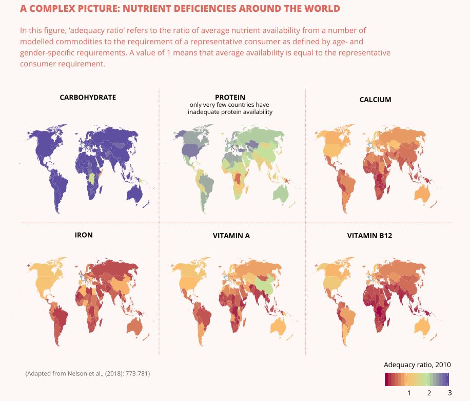 事实上,缺乏足够的蛋白质摄入只是影响世界各地人口的众多营养缺陷之一。一项面向2050年的研究预测显示,相对于碳水化合物和蛋白质,所有地区的人口将面临的钙和维生素D缺乏问题更为突出,而铁和维生素A的充足率则因具体环境而异。