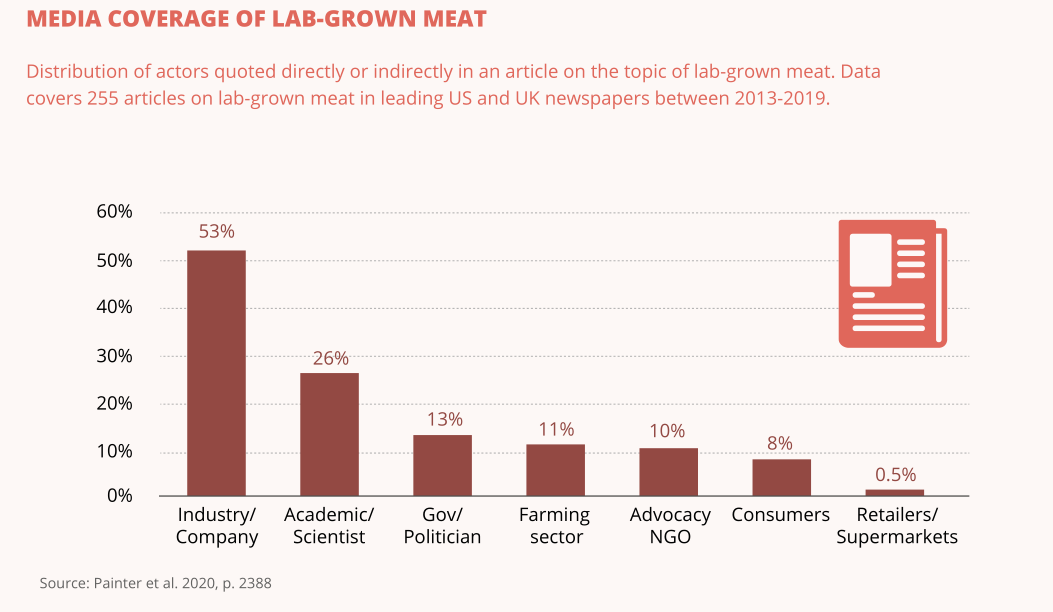 一项围绕2013年至2018年间英国和美国媒体报道内容的调查研究发现,75%实验室培养肉相关文章中大部分引用描述都来自行业与企业层面。这就意味着,这类报道所输出的观点都非常有利于替代蛋白行业并偏向人造肉制造商,从而进一步将消费认知引导到他们希望的方向上去。
