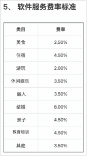 《服务费标准》共列出9大行业收费标准,其中游玩行业费率最低,为2%;用户高频使用的餐饮、住宿行业费率分别为2.5%和4.5%;费率最高的是婚庆行业,为8%。从行业角度看,这一费率并不算高。据悉,美团餐饮、美容、美发行业的佣金分别为8%、10%和6%。