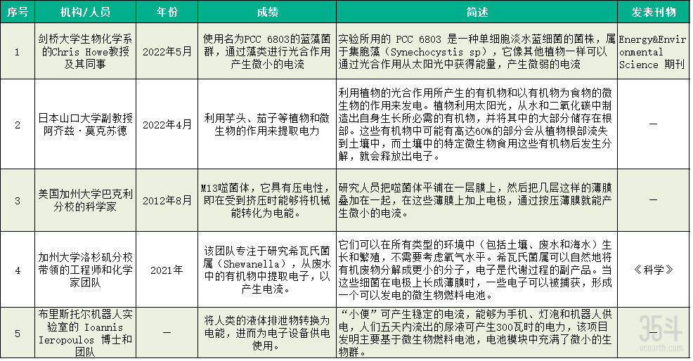 图:近年来部分有关微生物发电的成果,数据来源:据公开资料收集