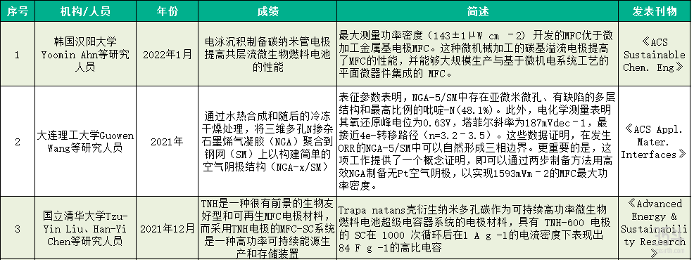 敢于正视问题,才能持续前进。针对上述难题,全球各国和地区,都在这一赛道上继续耕耘,并渐渐的开始埋头“解题”,以期在实践中找到问题的“正确答案”,功夫不负有心人,在众多科研人员的努力和汗水中,针对MFC供电能力不强的问题又向前迈进了一步。35斗统计了部分关于MFC的研究成果和相关进展。