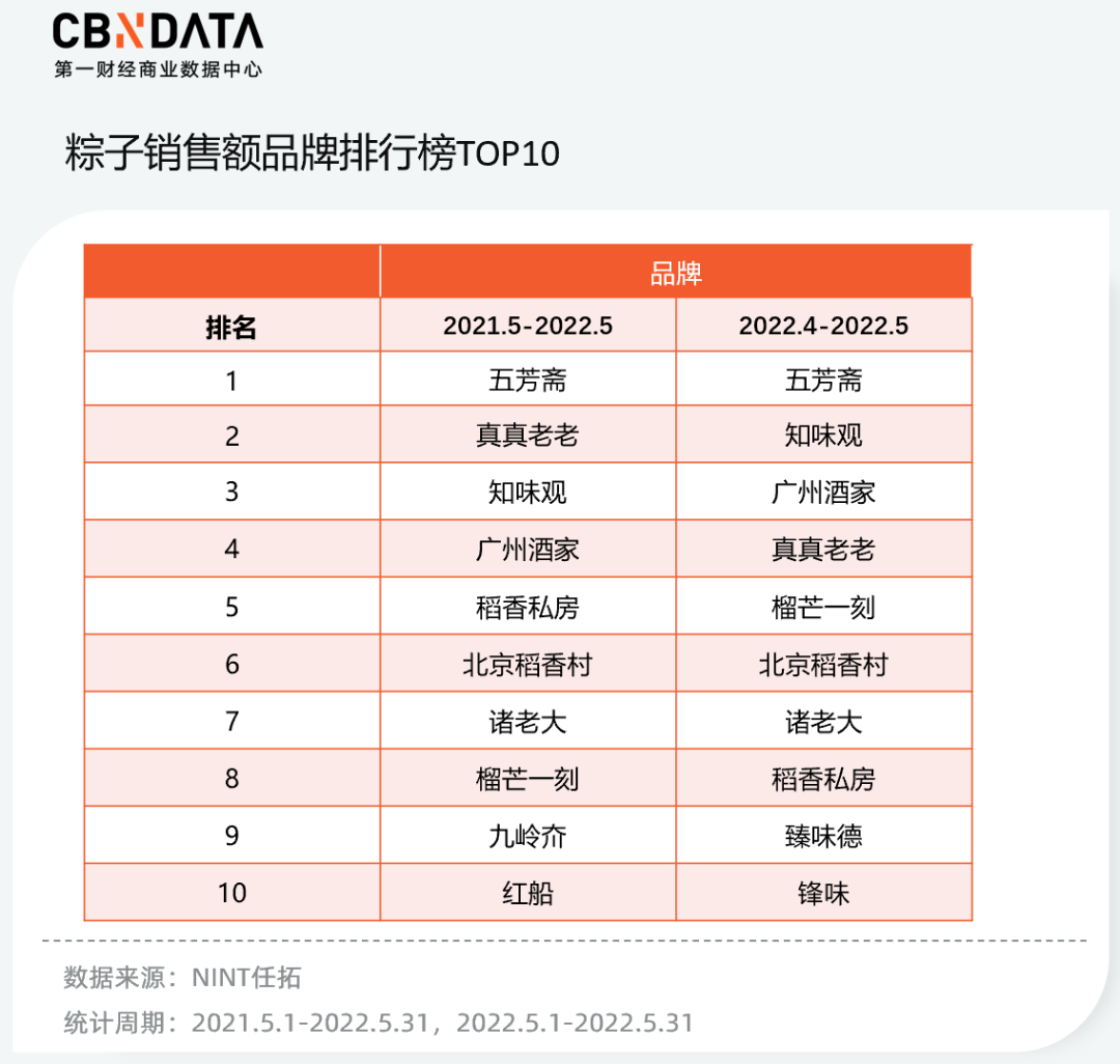 根据NINT任拓,在过去近一年和近一个月TOP30粽子品牌的销售情况中,五芳斋稳居第一,知味观、广州酒家等排名一直靠前,目前看来,老字号仍然更具品牌优势。同时一些年轻品牌正在突围,比如榴芒一刻、锋味挤进TOP10且排名正在提升。