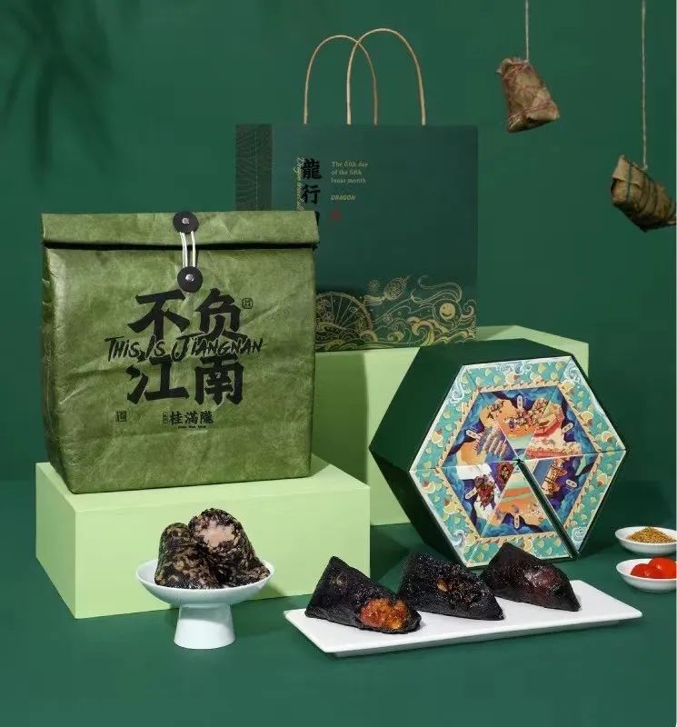 桂满陇的这款新品“把菜放进粽子里”,分别有江南梅干菜扣肉乌米粽、荔浦芋泥燕麦乌米粽、金贵陈皮洗沙乌米粽等多种口味,裹入粽子界“黑马”——江南一带独有的乌米粽。另外在包装上也独具特色,粽子盒采用特色折叠龙舟造型,外包装是国潮风的绿色环保简易纸袋,带有保温设计,可以循环利用,在商品评论区也可看到不少对外包装袋的晒单点评,可见外包装已经成为商品的一大卖点。