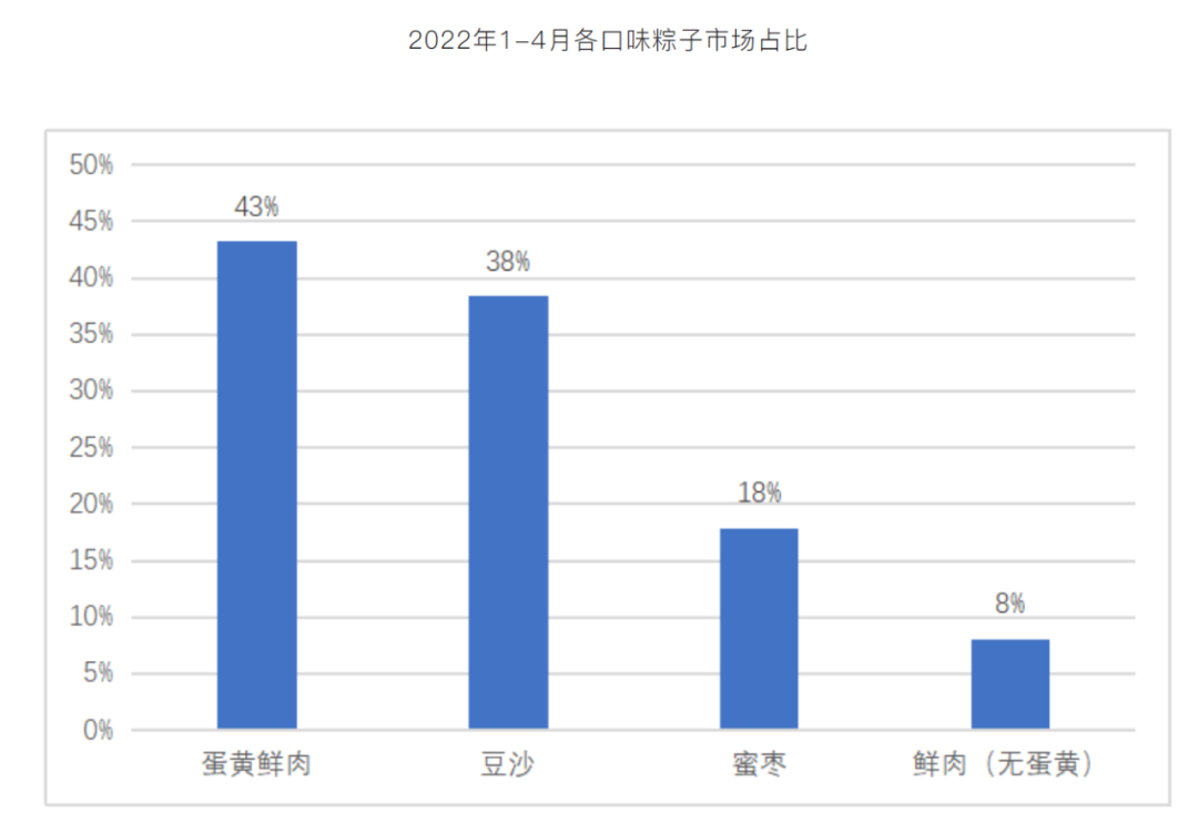 根据京东发布的2022端午消费趋势数据显示,5月中旬至下旬,低温粽子销量增长超550%,咸粽子占据主导优势,咸粽子/甜粽子的销售比例大概为4:1。魔镜市场情报也显示,蛋黄+鲜肉的馅料搭配占据主要地位,蛋黄鲜肉及鲜肉粽市场份额达51%。
