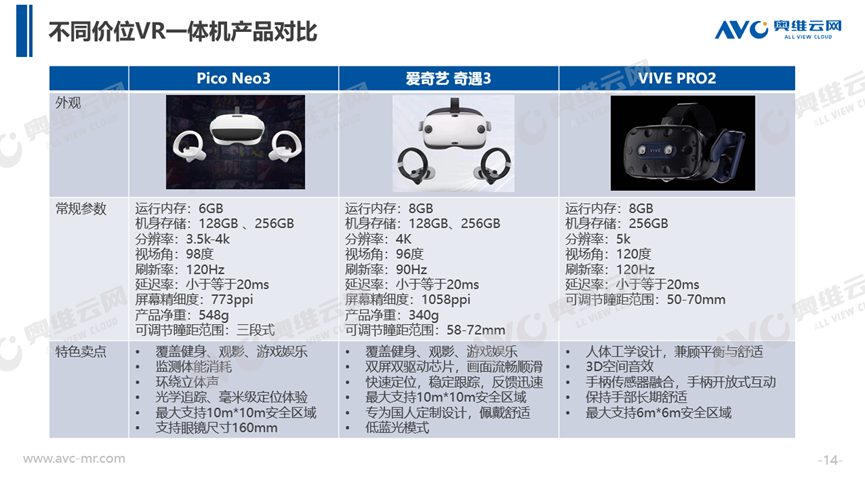 不同价格的产品在功能卖点上存在差异,我们选取不同价位的三款VR产品(Pico Neo3(一体)、爱奇艺奇遇3(一体)、VIVE PRO2(分体))进行对比,差异主要有以下几个方面:在常规参数方面,中高端价位产品运行内存多为8GB,相比起低端价位产品的6GB,在使用时更加流畅;低端价位的产品分辨率处在基础水平,中端价位有所提升,高端价位分辨率更高,画质更加清晰;中低端价位产品的视场角差异不大,而高端价位视场角更大,沉浸式体验感更强;中高端价位产品的瞳距采用无极式调节方式,适用人群更加广泛。在产品设计方面,随着价位的提升,产品更加注重佩戴的平衡感和舒适感。