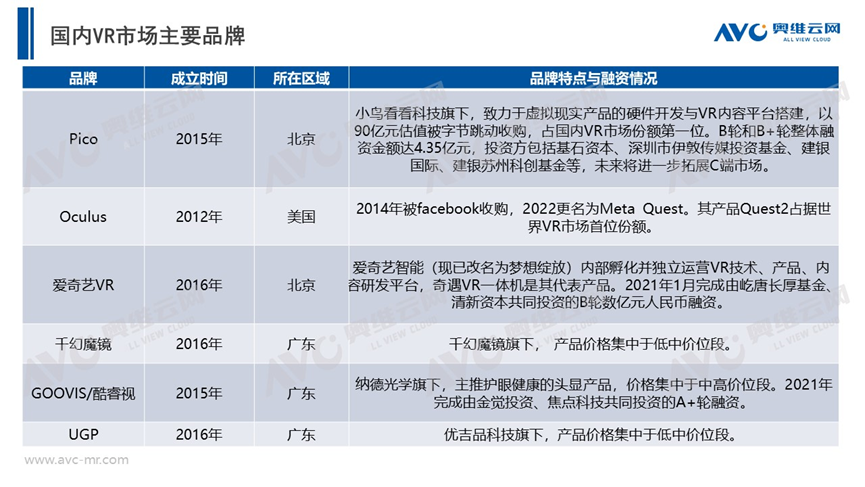 头部品牌分别是Pico、Oculus、爱奇艺VR。2021年8月,字节跳动斥巨资收购VR创业公司Pico,加码VR业务;Facebook旗下的Oculus VR设备产品在中国市场也有不俗的表现,作为世界级的成熟品牌,Oculus的VR设备不论从硬件体验还是软件生态上都具备强势的竞争力;爱奇艺作为百度生态战略内容的重要组成部分,依托其原有的广阔视频平台入局VR市场。