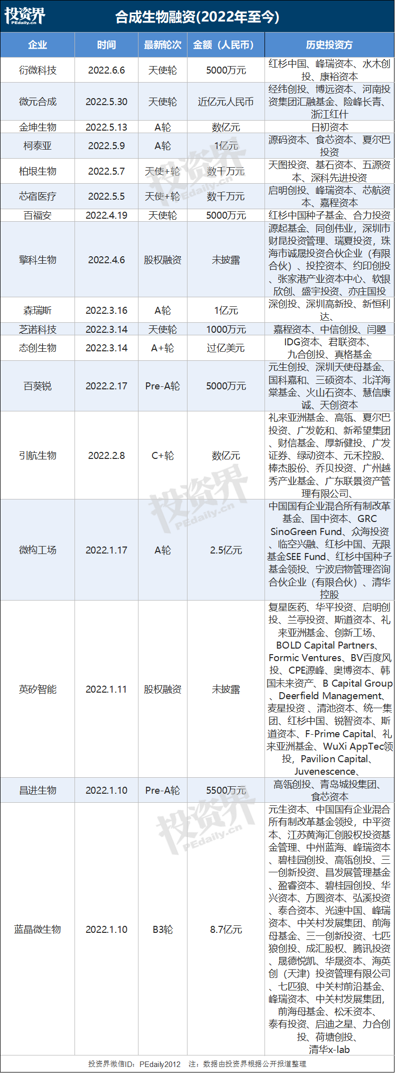 进入2022年,合成生物依然火爆——据投资界不完全统计,2022年至今至少有15家合成生物公司宣布融资,包括衍微科技、微元合成、柯泰亚、柏垠生物、芯宿医疗、擎科生物、森瑞斯、芝诺科技、态创生物、百葵锐、引航生物、微构工场、英矽智能、蓝晶微生物.....身后出现了红杉中国、深创投、高瓴、IDG资本、礼来亚洲基金、启明创投、奥博资本、碧桂园创投、经纬中国、华平投资、同创伟业、源码资本、君联资本、真格基金等知名VC/PE机构。
