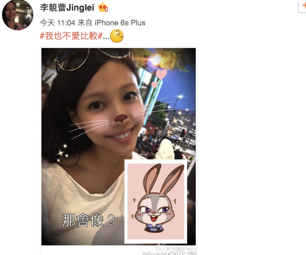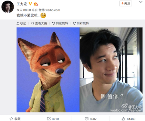 7月20日上午,王力宏与妻子李靓蕾“不约而同”在微博上晒出自拍,分别cos《疯狂动物城》中的狐狸尼克与兔子朱迪,并配文“我就不爱比较”。