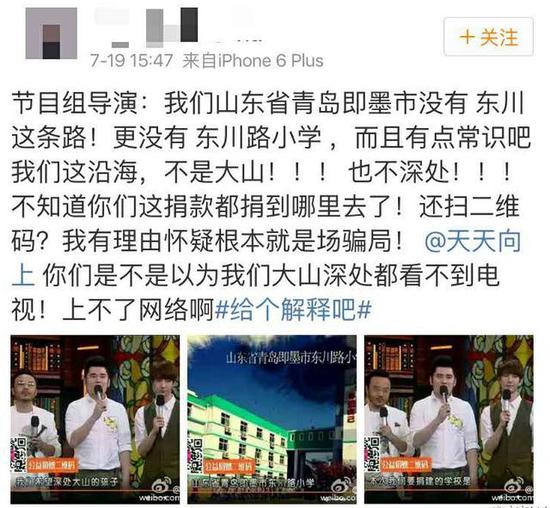 网友表示,首先山东青岛即墨市地处沿海,并非深处大山,并且即墨市是全国百强县,山东省县域经济“十强”第七位,并不是贫困地区。其次是即墨没有东川路小学这个学校。最后网友质疑二维码为某品牌app?不过这个app确实是用于慈善项目的,但网友也质疑这是为某品牌打广告。