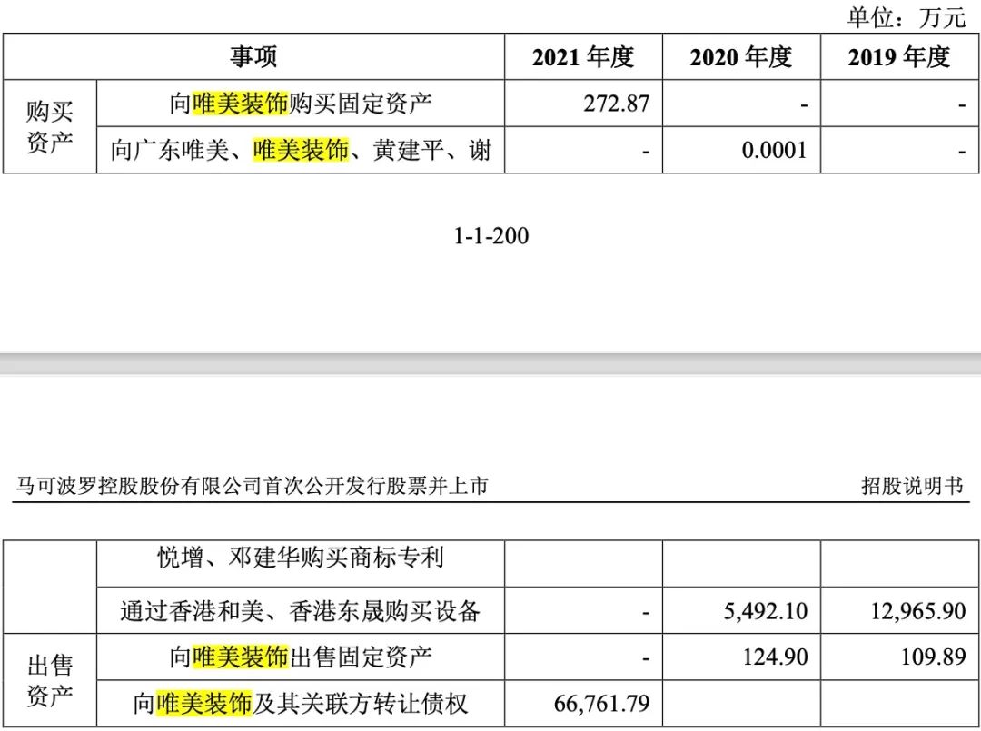 除了业务上的往来外,2019、2020年,马可波罗向唯美装饰出售了200余万元的固定资产,2021年,又向其买了200余万元的固定资产,并向唯美装饰及其关联方转让了6.68亿元的债权。