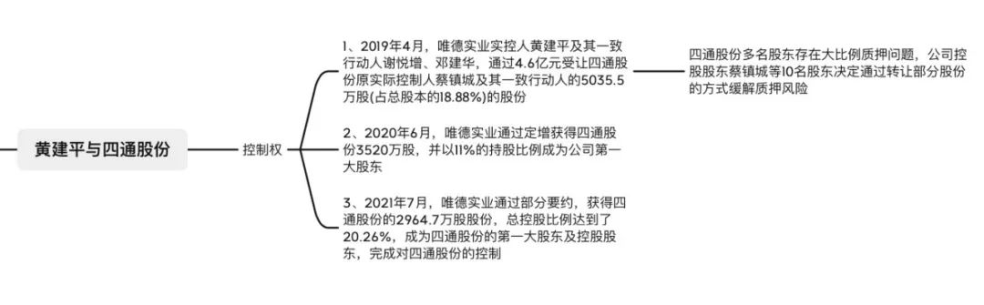 成为四通股份股东后,黄建平控制的唯德实业在2020年6月又通过定增获得四通股份3520万股,并以11%的持股比例成为公司第一大股东。