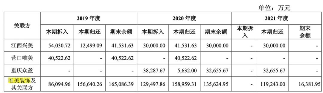 此外,报告期内,马可波罗与关联方发生了大量的资金拆借,其中仅唯美装饰2019年、2020年分别拆入8.61亿元、16.51亿元,2019年-2021年,分别归还15.66亿元、15.9亿元、11.92亿元。2021年没有拆入资金,但2021年还有期末余额1.64亿元。