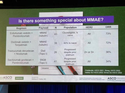 从现场披露的PPT内容来看,维迪西妥单抗联合PD-1数据表明,尿路上皮癌患者无论在治疗线数、HER2和PD-L1表达状态的情况下,均能从中获益。此外,维迪西妥单抗无论在HER2高表达还是低表达尿路上皮癌治疗领域,数据结果都超越了晚期尿路上皮癌既有治疗药物的疗效。
