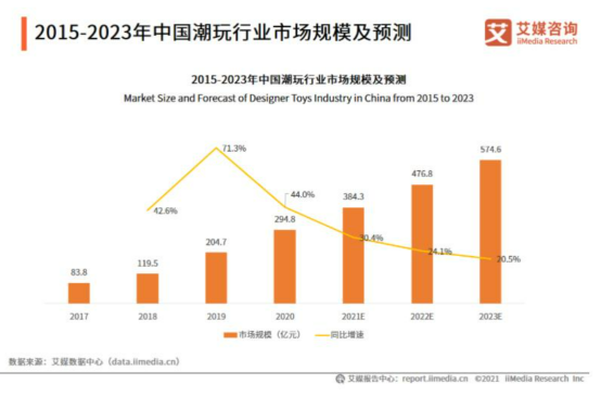 泡泡玛特成功之后,围绕潮玩的相关研究分析也有许多。据艾媒咨询的数据显示,2019年爆发式增长后,虽然增速一直在放缓,但2021年国内潮玩市场的规模预计将会达到 384.3 亿美元。