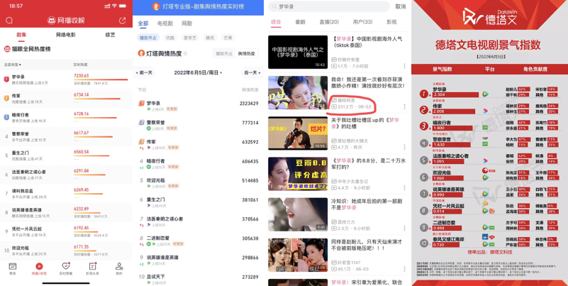 它的首爆,主要是体现在热度层面。上线不到15小时腾讯点击量破1.5亿、连更三日后破5.5亿,《梦华录》成近期腾讯最热新剧。除此之外,微博热搜话题突破99+、#电视剧梦华录#官方阅读话题破10亿,#电视剧梦华录#、#顾盼生辉#两大超话登上影剧综超话no.2、no.3,以及上线第二日就登上灯塔、猫眼等各大数据榜单首位的成绩,足以一窥该剧热度。