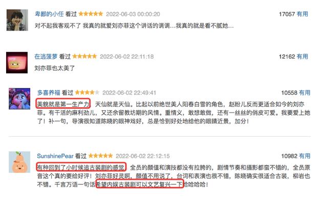 市场也是极具识趣的。每当这种现象出现,“粉丝剧”也就成了大众心照不宣的“共同解读”。《梦华录》当前的豆瓣评分,暂未出现此类现象,不过为“刘亦菲美貌”、“情怀滤镜”特来留言的,也有一批。