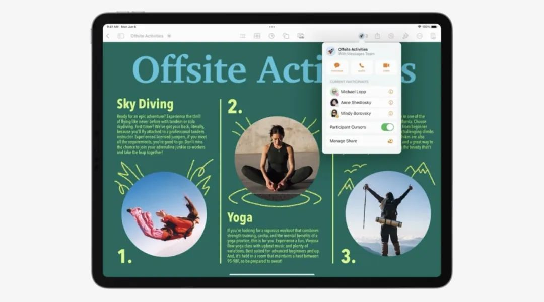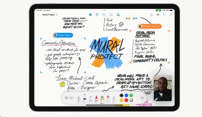 而在FaceTime中,不同成员之间可以进行“头脑风暴”式的协作,成员可以共享一张可以“无限拓展”的桌面,并在这个“虚拟桌面”上进行讨论。后续iPhone、iPad 和 Mac电脑都会支持该功能,苹果将其称之为“Freeform”。