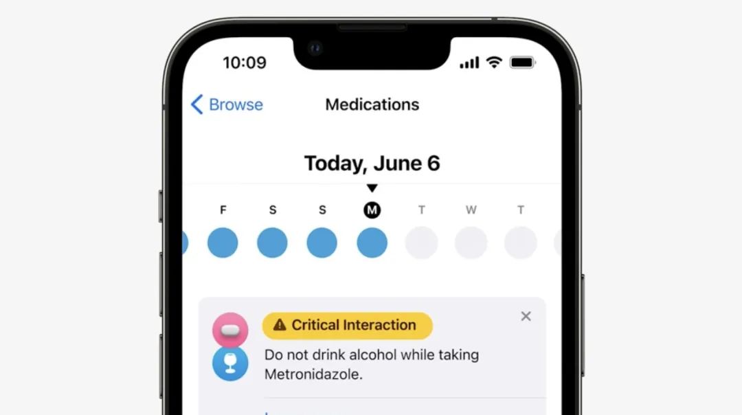 watchOS 9还增加了一个新的用药App,可以帮用户追踪和管理药物,比如提醒用户按时吃药。用户可以通过扫描药瓶身上的条码直接录入药物信息。值得一提的是,用药App会将可能产生“相互作用”的药物进行智能提醒。