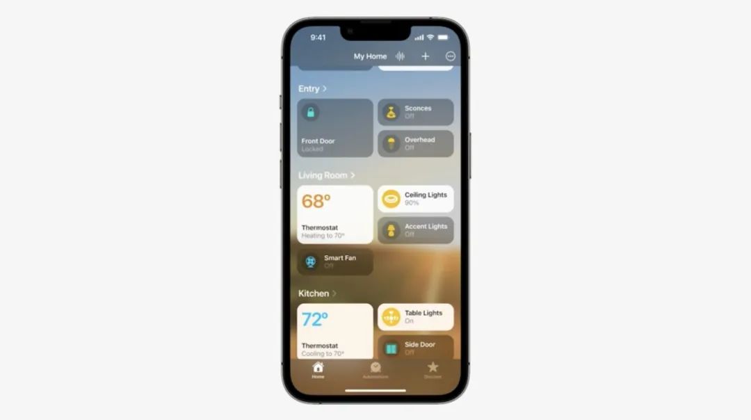 此外,苹果也对家庭App中的控制界面进行了重新规划,智能家居各类设备的状态都可以在锁屏界面中进行更直观地展示。