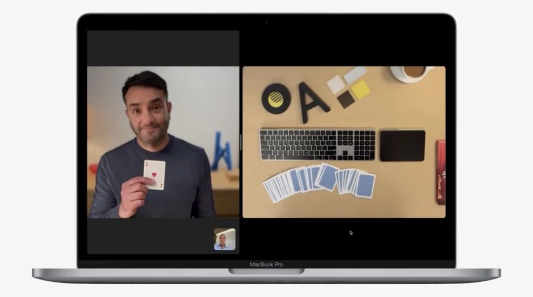 这还不算完,苹果还利用iPhone的超广角镜头+自研视觉算法,直接呈现了一种“桌面视图”,也就是用手机摄像头拍到你的桌面,鼠标、键盘一览无余,效果比较惊艳。目前,苹果与主流视频会议平台基本都进行了合作。