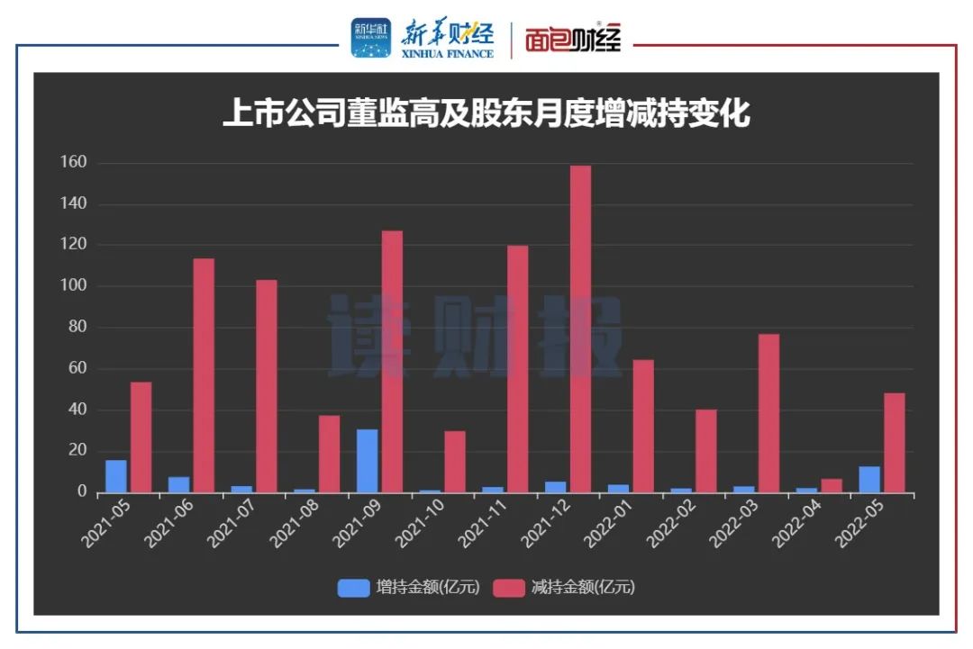 新华财经和面包财经根据上市公司的信披数据统计,2022年5月,沪深两市上市公司董监高及其关联人减持金额合计约48.27亿元,涉及126家公司;增持金额合计约12.6亿元,涉及93家公司。增、减持金额相抵之后,净减持金额35.67亿元。