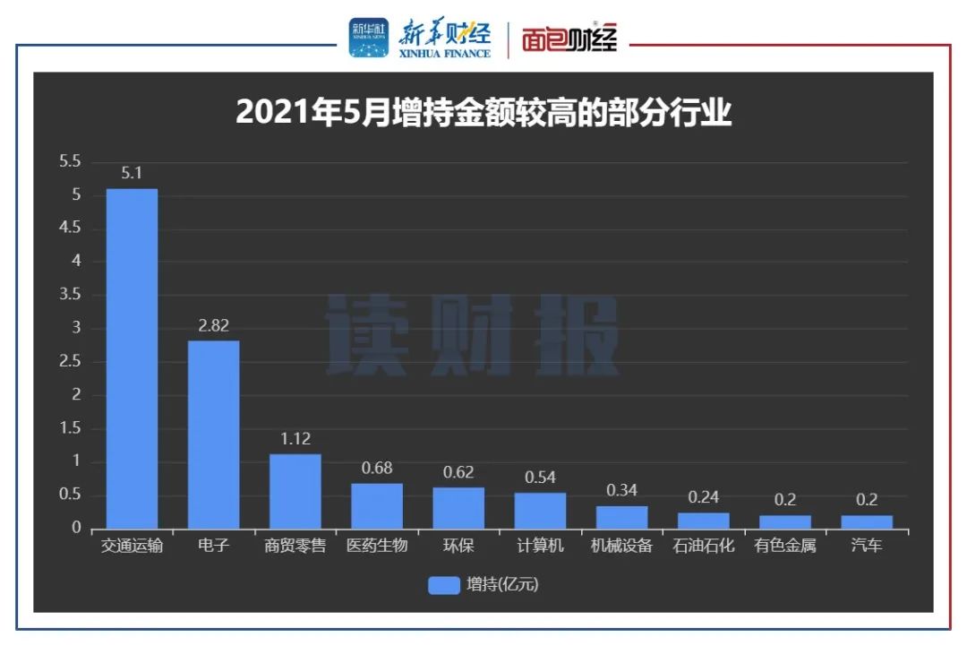 5月份,各行业中,石油石化行业增持金额均居首位,交通运输行业增持金额最多。
